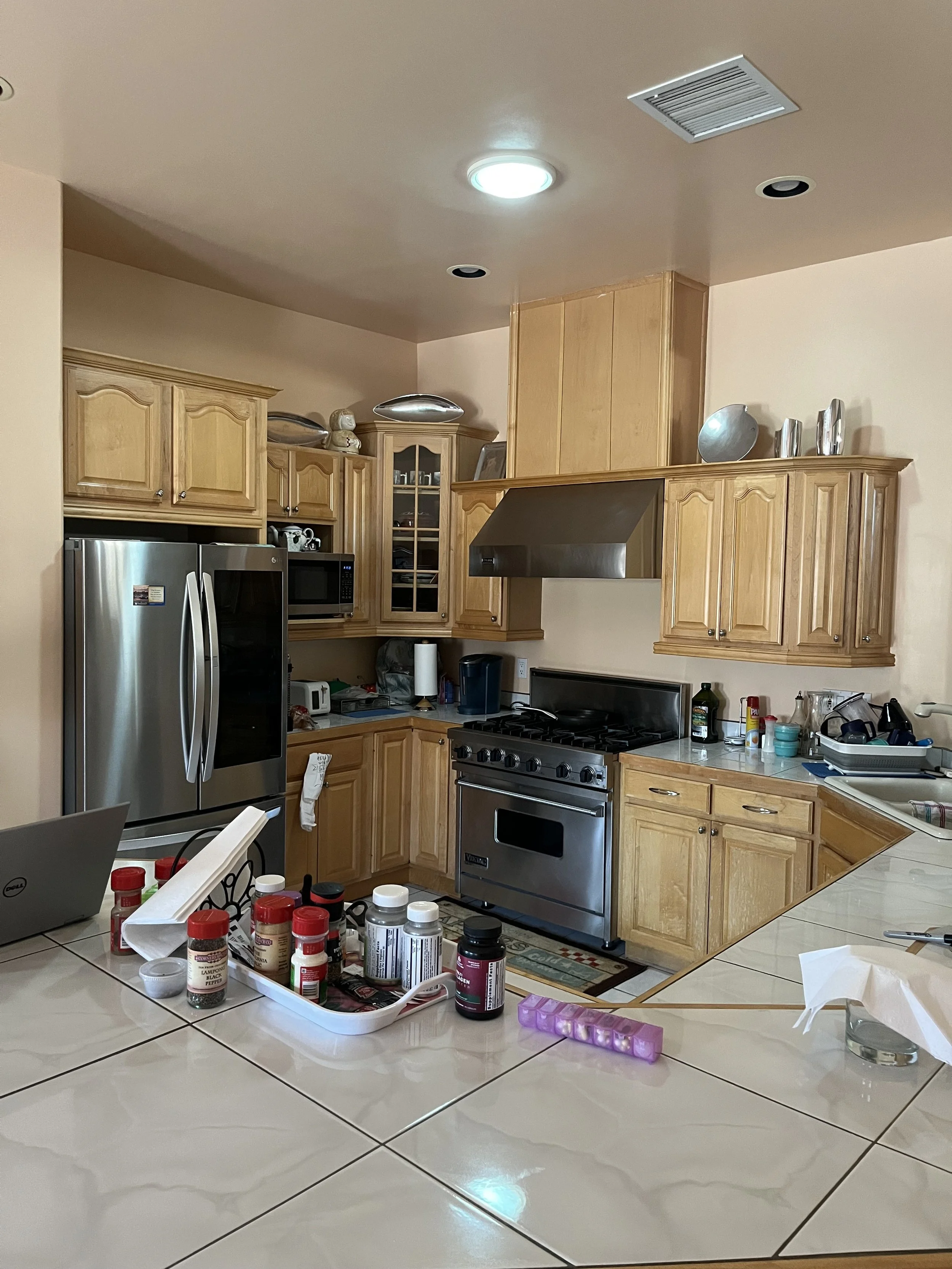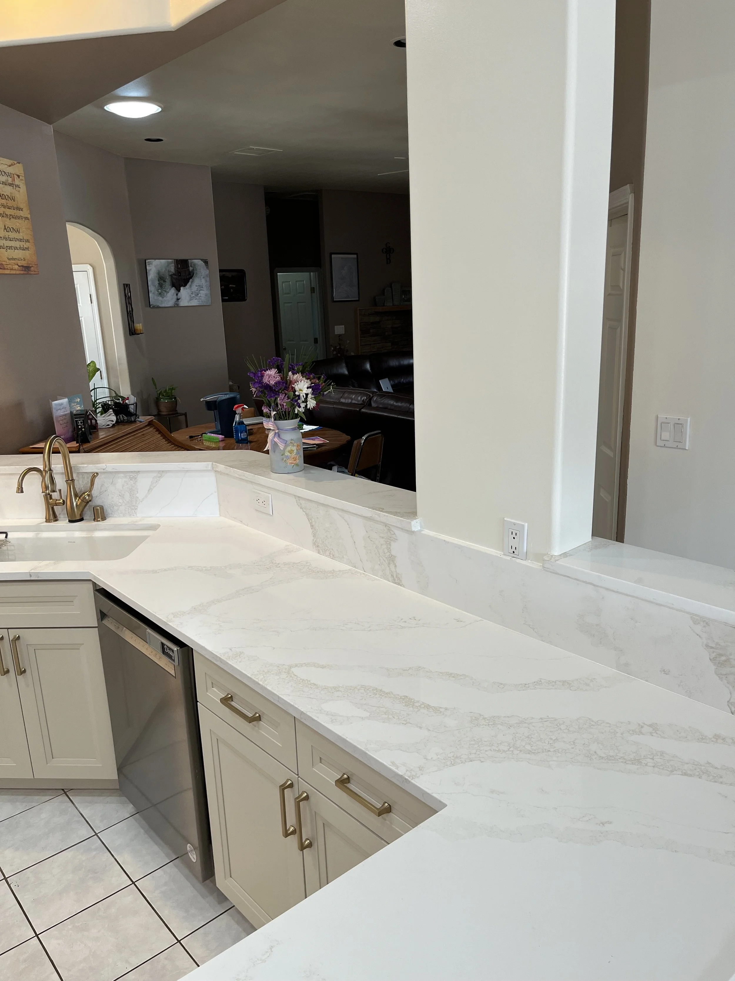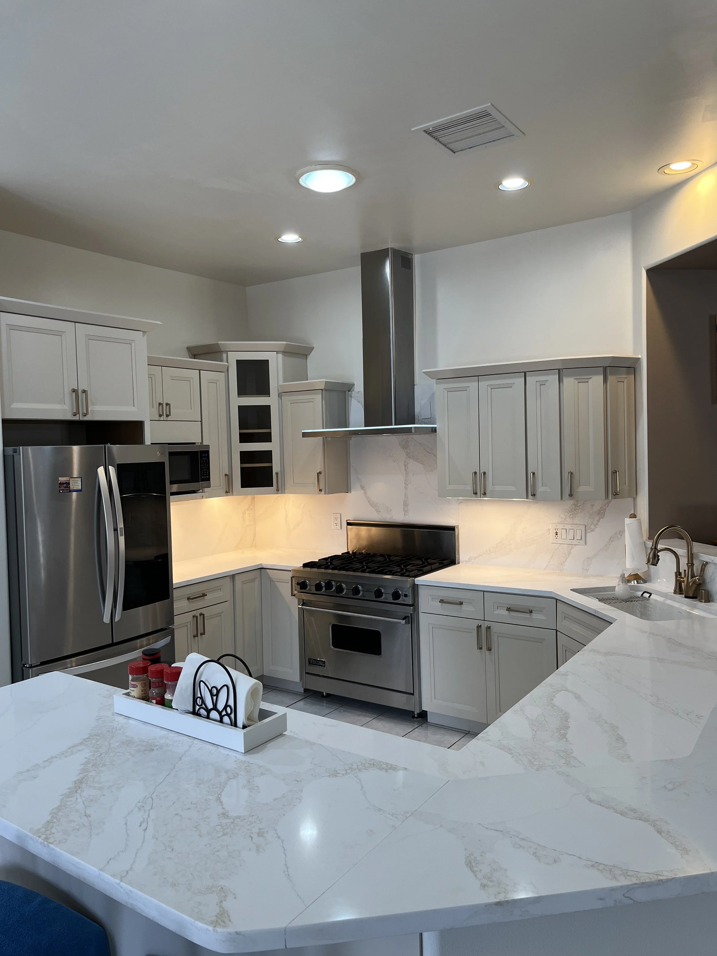 Espanola, NMKitchen reface new doors manufactured with a “shaker deep bevel” style with white maple wood. New quartz countertops and matching quartz backsplash Vallejo Gold by De La Terra. Previous cabinets were oak.